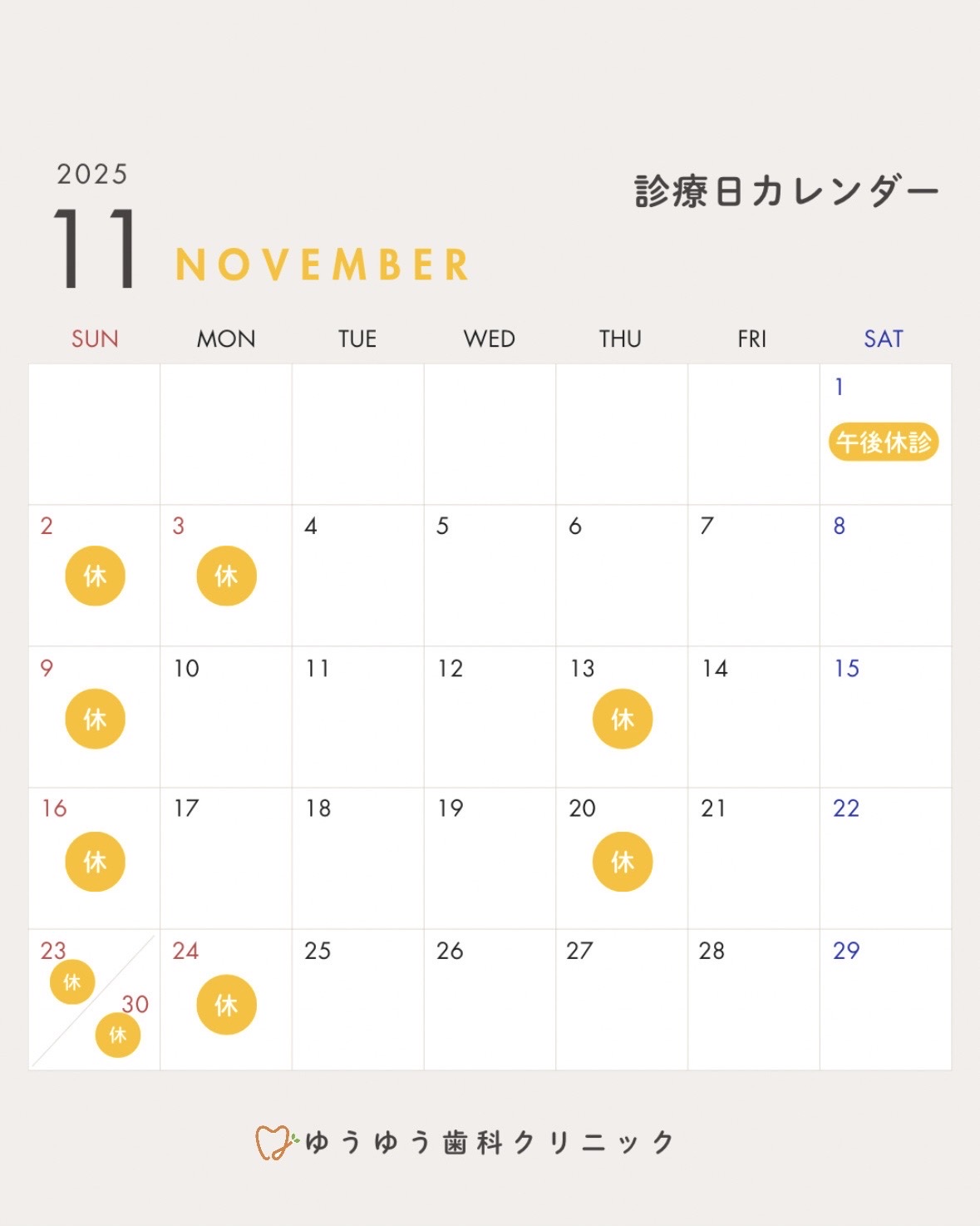 11月1日(土)は広島県歯科医師会の行事参加のため、午後の診療を休診とさせていただきます。